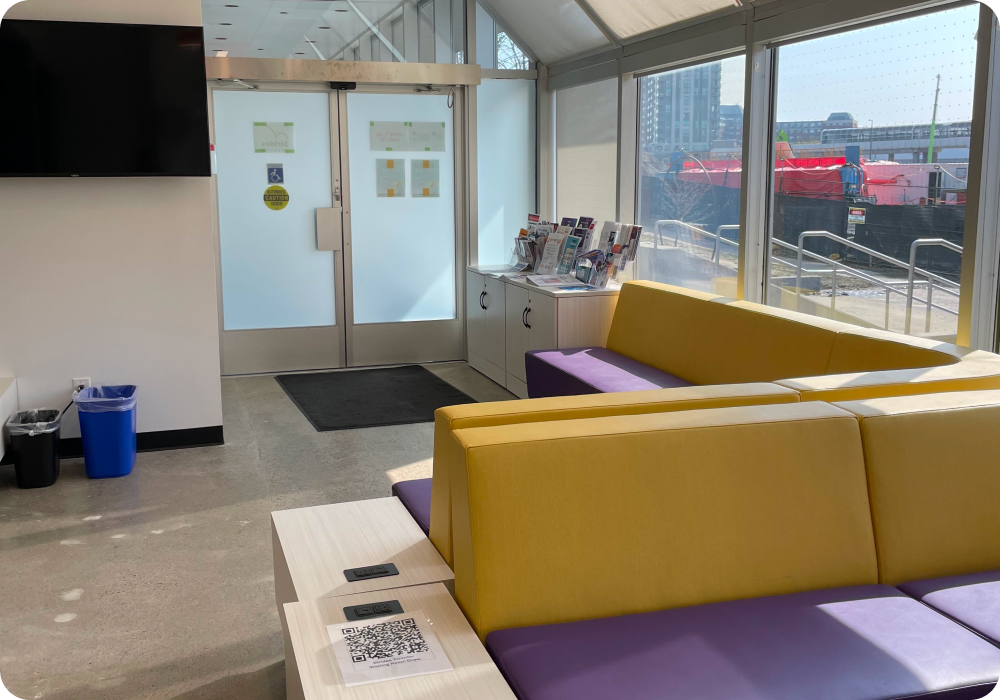 - Turn right off of elevators and buzz in. Check in with receptionist and ask for What’s up Walk-In.